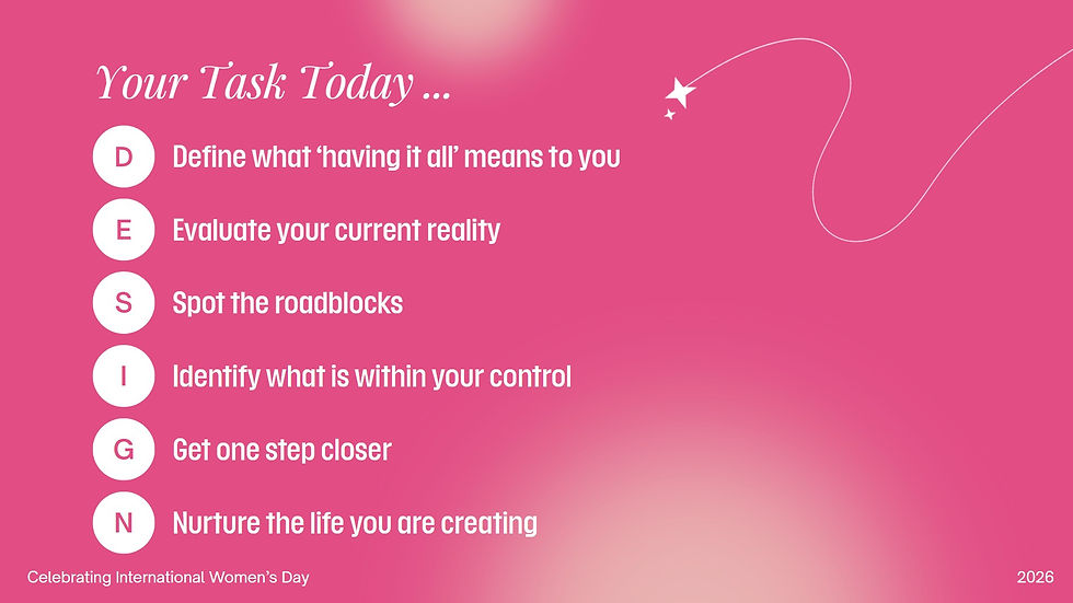 Importantly, this is not a passive process. Work–life integration doesn’t simply happen over time. It requires intention, reflection, and action. Dr McConnell encouraged us to approach this as a DESIGN task: